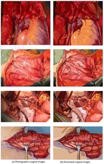 To prove our assumption, we chose 10 photographic surgical images and produced their illustrated versions by hiring professional scientific illustrators. The photographic surgical images and their illustrated counterparts are presented in Figure 1, Figure 2 and Figure 3. Before producing the illustrations, the illustrators were instructed to preserve as much fine details as possible. The target images were collected from various sources and are released under ’fair use’ purpose.