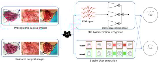 In this paper, we produced illustrated surgical images to prove their ability to reduce the negative emotional responses engendered by photographic surgical images. We executed emotion recognition processes on 40 participants to compare their emotional responses to photographic and illustrated surgical images. The emotional responses were estimated in a bi-modal approach: a deep learning-based emotion recognition model from EEG biosignals was combined with a 9-point metric user annotation. From the results, we conclude that illustrated surgical images indeed capable of reducing the negative emotions of participants.