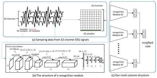For the training of our model, we employ the DEAP dataset [40], one of the most widely used EEG datasets. The DEAP dataset consists of preprocessed EEG signals and their corresponding labels which describe emotional states. As instructed by the original authors [40], and similar to our previous study [38], we downsample the EEG signal in DEAP to 128 Hz and process it with a 4.0–45.0 Hz band pass filter. Therefore, we extract 128 × 60 samples from a trial for 40 channels of the dataset. Among the 40 channels, we exclude 8 for normalization and employ 32 channels for the input of our model. For each input channel, we prepare 32 consecutive samples for an input for each module of our model, effectively creating 32 × 32-sized input data. Figure 5 (a) illustrates the sampling process of EEG data, (b) shows the structure of a recognition module, and (c) shows the overall multi-column structure of the model.