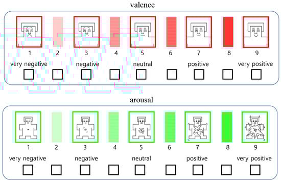 For user annotation of emotional responses, we presented participants with a nine-point metric separated into valence and arousal. They were asked to mark the metric for the photographic and illustrated surgical images they saw. The leftmost point means very negative reaction, which matches to in EEG-based estimation, and the rightmost point means very positive reaction, which matches to 1. The mid-point signifies a neutral reaction, which matches to 0. The nine-point metric form for user annotation is presented in Figure 6.