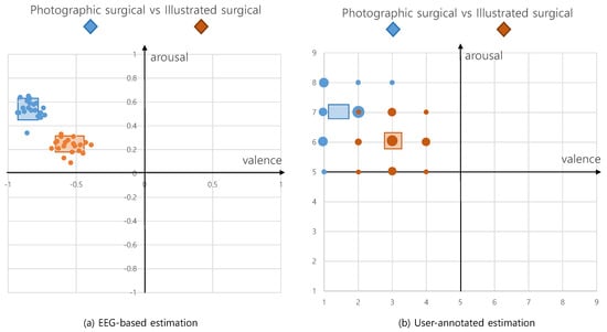 The p values for this second t-test are presented in Table 4. For , who watched photographic surgical images, the valence and arousal estimated from EEG biosignals and annotated by users are very closely related; the strong negative emotion recognized from photographic surgical images is consistent regardless of the recognition scheme. However, for , who watched illustrated surgical images, the valence is closely related, while the arousal is not. Therefore, we cannot reject except in case of arousal. We assume that pictures of organs, blood, and flesh effect similar negative emotions in viewers, even though they are reduced by the illustrated representation. Therefore, the different approaches for estimating emotions show consistently similar valence scores; for arousal, however, ordinary people have only rarely seen surgical images even, even in their illustrated form. Users who have watched illustrated surgical images in the first round of the emotion recognition experiment through EEG biosignals may pay less attention in the second stage experiment using user annotation. Therefore, the arousal values for illustrated surgical images in user annotation can be lower than those in EEG-based estimation.