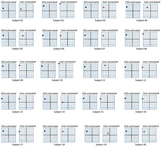 Results from photographic surgical images. Subjects 01∼20 participated in the experiment for photographic surgical images. The left box, which corresponds to EEG-based recognition has a range of , while the right box corresponding to user-annotated emotion has a range of . The x-axis of each box represents valence and the y-axis represents arousal.