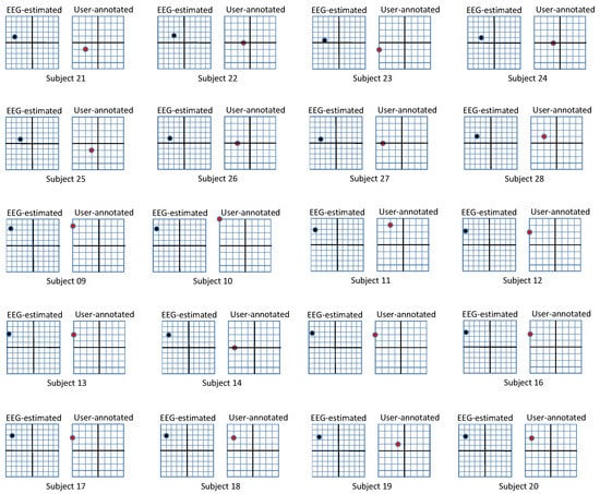 Results from illustrated surgical images. Subjects 21∼40 participated in the experiment for illustrated surgical images. The left box, which corresponds to EEG-based recognition has a range of , while the right box corresponding to user-annotated emotion has a range of . The x-axis of each box represents valence and the y-axis represents arousal.