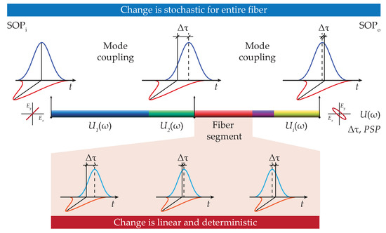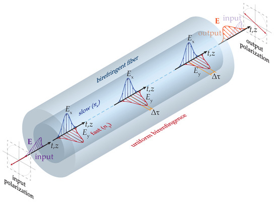 The refractive index of anisotropic materials depends on light polarization, i.e., different polarized optical waves propagate with different propagation constants. In turn, this yields different phase shifts between them. This effect directly relates to the fiber birefringence. Intrinsic fiber birefringence is typically an unwanted side effect. The intrinsic fiber birefringence arises from the imperfect fiber manufacturing, such as core ellipticity, bending, twisting, or even material impurities and inhomogeneities [34]. As a result, these rather random imperfections cause residual local stress between the fiber core and fiber cladding in each fiber segment. Generally, higher stress induces larger birefringence of the optical fiber and vice versa. This also leads to the different thermal and mechanical properties of conventional silica-based fibers and makes fiber birefringence sensitive to a range of external parameters such as temperature, stress and strain. The birefringence sensitivity then originates from the elasto-optic effect and fiber compressibility [35,36]. As a consequence, polarization characteristics of optical fibers are influenced as well, via a change in a propagation time of two orthogonally polarized modes that run through the fiber with different group velocities. The propagation of two orthogonal modes in the optical fiber is schematically shown in Figure 1. Resulting time changes are conventionally represented by differential group delay (denoted here as DGD or ), and a principal state of polarization (PSP). In situations when optical signal is transmitted via optical fiber, this leads to the effect of PMD with a strong stochastic nature [34,37].