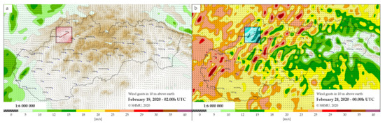 Wind conditions in selected country area. (a) A day of weak wind conditions with a wind speed up to 5 m/s. (b) A day of strong wind conditions with a wind speed up to 20 m/s. Highlighted squared boxes show the testing area, where the optical power wire cables were located.