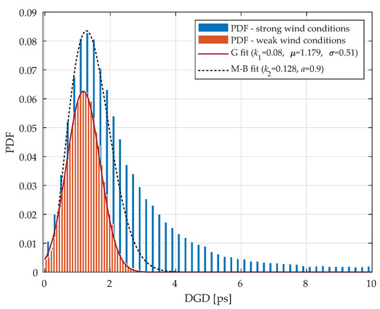 Figure 7 shows probability density functions (PDF’s) of measured DGDs for all 88 wavelength channels. In case of weak wind conditions (orange histograms), we can see that the resulting PDF resembles a Gaussian-like curve, with an average DGD of 1.17 ps and a maximum of 4 ps. The experimentally retrieved distribution is then fitted as follows: