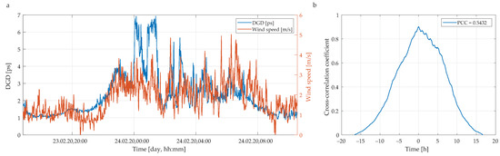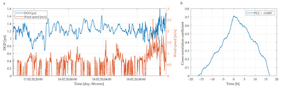 In contrary, in case of strong wind conditions, the measured lines of average DGD and wind speed are obviously more correlated. Figure 9a shows the average DGD values (blue line) and wind speeds (red line) as a function of a time. In this case, the cross-correlation coefficient is sharper (see Figure 9b) and yields linear correlation, with a PCC of about 0.54. That indicates a very strong dependence between wind conditions and measured DGD values.