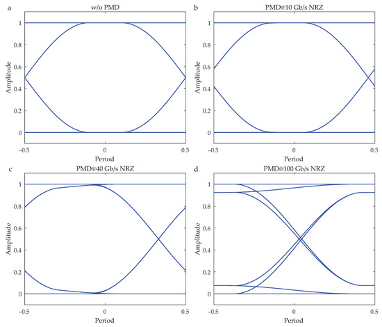 The quality of the transmitted high-speed optical signals is evaluated via eye diagram. Optical NRZ signal with a specific bit rate is degraded by the PMD based on Equation (4). Then, the eye diagram opening, , is defined as follows [48,49]: