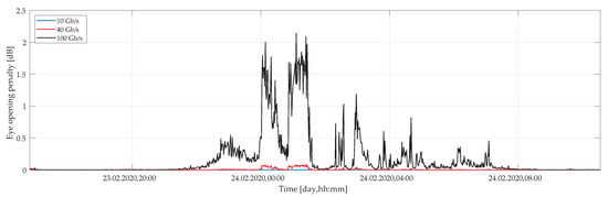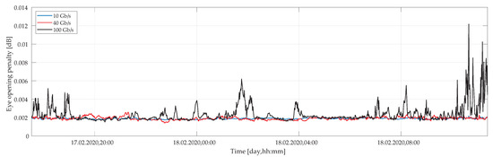 Moreover, the eye opening penalty was calculated for each measured set of polarization parameters in time and wavelength. Figure 11 shows average values of EOP under a weak wind conditions as a function of a time for different bit rates of 10 Gbps, 40 Gbps, and 100 Gbps. We may observe only a marginal impact of EOP under such weather circumstances. In the worst case, i.e., for 100 Gbps, the EOP hardly reaches 0.012 dB level, which is good enough to maintain a reliable link operation.