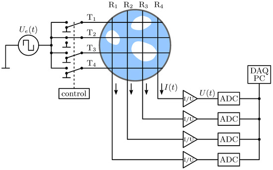 An alternating excitation signal is switched to the transmitter wires consecutively. Due to the different electrical conductivities of the fluids under investigation and their spatial distribution, different conductances G are present at the virtual crossing points of the transmitting and receiving wires. The resulting electrical currents at the receiver wires are converted into voltage signals by transimpedance amplifiers. Sample and hold circuits are used to extract the DC components that are subsequently digitized and sampled in parallel for all receiver wires, cf. [1]. After all transmitter wires have been activated once, a two-dimensional matrix is obtained for this frame k.
