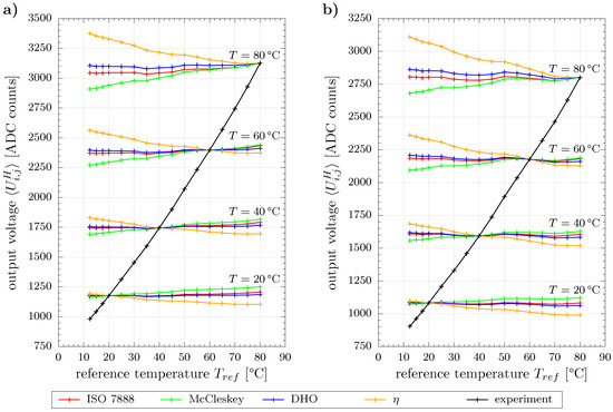 In order to evaluate the performance of the temperature compensation models, we applied them to the cross-sectional averages of the measured output voltages of the WMS. More precisely, the experimental data is treated as reference measurement and compensated according to Equation (7) in order to give at four exemplary temperatures , cf. Figure 5.
