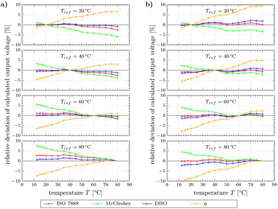 Relative deviation of compensated output voltages (cross-sectional average) for (a) deionized water and (b) water mixture.