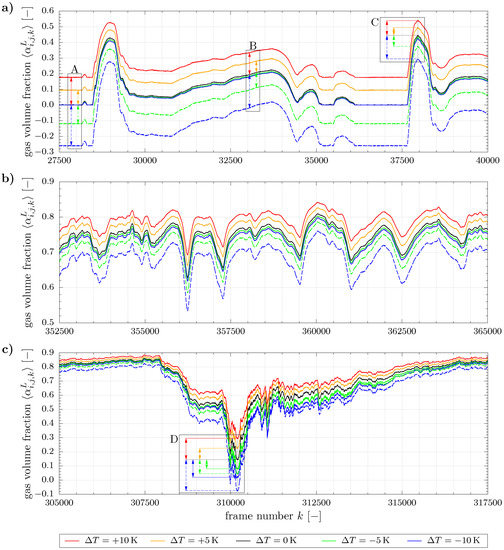 Firstly, when focusing on positive as well as on negative without cutting, all deviations correlate with the cross-sectional share of liquid, which is related to the magnitude of as a matter of course. This behavior is highlighted at three exemplary liquid levels in details A to C in Figure 7a. The strongest influence is observed for a completely liquid filled pipe (detail A) and the deviations decrease with increasing values of (details B and C) due to the increasing cross-sectional share of gas associated pixels, to which temperature effects do not apply. This is also confirmed by comparing the absolute differences in Figure 7a with those of any frame of the gas dominated flow in Figure 7b. The same effect is well displayed in a dynamic representation in the ascending part in Figure 7c that reflects the falling liquid level after a slug passage.