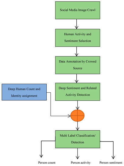 The proposed approach consists of seven steps in the pipeline. The block diagram in Figure 2 provides the architecture of the proposed methodology for visual sentiment and associated human activity analysis fused with a deep human count tracker.