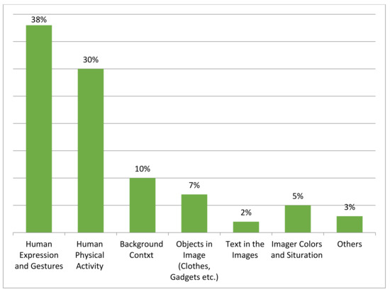 As expected, the responses by participants provided detailed perception about the visual content based on image context in a methodological manner. It is evident from Figure 7 that the background context information influences the evoking of common human perception about the actual scene to visualize the human sentiment with related physical activity (e.g., 41% human expression).