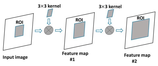 As previously mentioned, there is a certain gap in the extraction accuracy of a target image between the detection algorithm based on direct regression and that based on the candidate frames. Therefore, this paper adopts a target detection algorithm that combines the ideas of YOLO direct regression and detailed feature extraction based on candidate frames and uses higher resolution to achieve better detection results. As shown in Figure 1, after convolution, the ROI in the feature map is larger than ROI in the input image, which is because the convolution operation will cause a single pixel in the input image to affect the value of nine pixels (3 × 3 pixels) in the output image. In Figure 1, the ROI of feature map 2 is greater than the ROI of the previous layer, and since the convolution operation continues to the end of the network, the ROI will become larger and larger and will eventually be the same as the input image; this means that all data of the input image will be treated as an ROI, which will result in a reduction in the calculation accuracy of the final ROI. Therefore, after the convolution operation, it is necessary to derive a suitable ROI selection plan.
