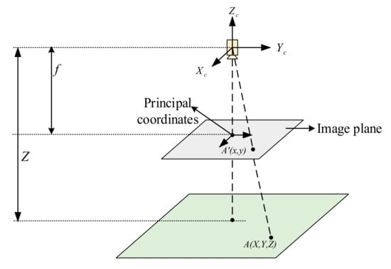 Under the camera coordinate system, the 3-dimensional (3D) point coordinates are projected on the planar image, and the coordinates of the resulting 2-dimensional (2D) points are expressed as . According to the principle of small hole imaging, the projection relationship between the two points is shown as follows: