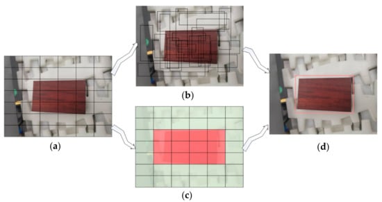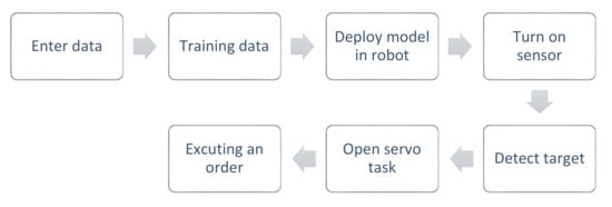 The overall workflow of the test system is displayed in Figure 8, and it was as follows. First, the dataset was entered, and the YOLO-v2-ROI network model was trained for target detection and classification on the server. Then, the trained model was deployed to the robot ROI, and the vision sensor was turned on; when the camera detected the presence of a certain target object, the robot was guided to the target position, and the corresponding task was performed according to the system action mode, as shown in Figure 9.
