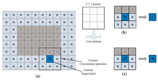 An example of ROI determined by a convolutional layer is presented in Figure 6, where each box corresponds to a pixel, “N” and “I” represent RONI (region of not interest) and ROI data, respectively, and the kernel size is 3 × 3.