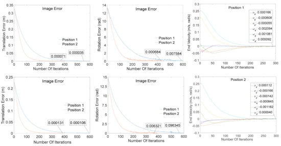 Due to the strong environmental stability of the visual detection algorithm, the sensor could detect the target position effectively, even in the complex environment. The image error and the robot arm data of a certain servo task (the end speed consisted of linear and angular velocities) are presented in Figure 14.
