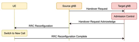 Cell-level mobility or handover refers to transferring the ongoing data transmission from one network component (gNodeB (gNB), Remote Radio Head (RRH), etc.) to another. The handover procedure consumes resources, causes connection interruption and differs depending on the handover type (INTER/INTRA-gNB, with or without 5G Core Access and Mobility Management Function (AMF) change, etc.), the network requires a varying level of internal communication and signaling, where the least complex one, INTER-gNB Xn handover procedure [] is depicted in Figure 1.