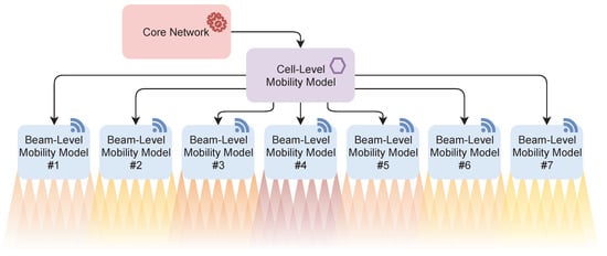 To summarize, the core network assigns users to the cell-level mobility model (e.g., via inter-gNB handover with AMF change). The cell-level mobility model then assigns the users between individual BSs (gNBs). On each BS, the beam-level mobility management model assigns each user the serving beam. The core network only knows the approximate user location (area level information), the mobility management model has serving cell information, and the serving beam information is only available at the serving beam-level mobility model level.