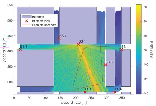 The considered wireless channel model is based on a ray-tracing-based radio propagation modeling proposed by the Mobile and wireless communications Enablers for the Twenty-twenty Information Society (METIS) project [], which is included in the 3GPP specification 38.901 []. Detailed information about specific radio propagation characteristics and channel model properties are discussed in more detail in the aforementioned references. The area of interest, in which the simulations are performed is an urban area with the central square and several surrounding buildings. The considered layout is based on the part of the Madrid grid, proposed by METIS society in Reference [], and is shown in Figure 3 in Section 3. The area consists of 7 mm-Wave BSs and several buildings. The BSs in the area are mm-Wave BSs operating at 30 GHz carrier frequency able to create 32 different beams. Moreover, each BS includes a linear array of 32 antenna elements, which form the beams based on the phased array principle. The codebook for beam selection ensures the orthogonality of the individual beams and is based on the discrete Fourier transform matrix. The dataset considered in this work was simulated by creating a mobile UE, in which movement was defined by switching waypoints on the deployed map with an additional curvature. The UE measures the RSRP from all available beams every 0.36 s, which correspond 0.48 m mean distance between two measurements if the UE moves at 5 km per hour mean speed.
