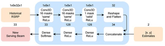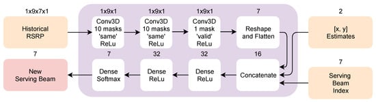 The structure of the proposed beam-level mobility model is shown in Figure 4. Its first input, including current and 8 last RSS measurements per each beam, is processed by the convolutional branch of the model. The window size of 9 measurements was derived experimentally. Larder window sizes did not improve the model’s performance and increased the complexity of the proposed solution, while the performance of the model decreased with smaller window sizes, after introducing uncertainty to the measurements. The convolutional branch includes 3 convolutional layers and serves as the feature extractor for the next part of the model, as well as a signal filter. All three convolutional layers have a filter shape of , Rectified Linear Unit (ReLU) activation function, ‘same’ padding, and 16 masks, with the last layer having ‘valid’ padding and 1 mask. Its result is then concatenated with the second input, namely current positioning information. As stated above, the current serving beam information was removed from the model due to the fact, that the proposed beam-level mobility model does not consider hysteresis. The beam-switching stability of the model is ensured in the training phase. Additionally, beam-level decision-making does not require additional network signaling and works with much lower interruption times than normal HO. The rest of the model consists of three dense layers, with new serving beam information evaluated at the output. The model was designed to minimize the complexity of the system and speed up both training and evaluation, and, as a result, it contains only 27,874 trainable parameters.