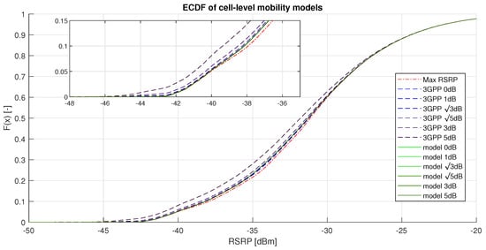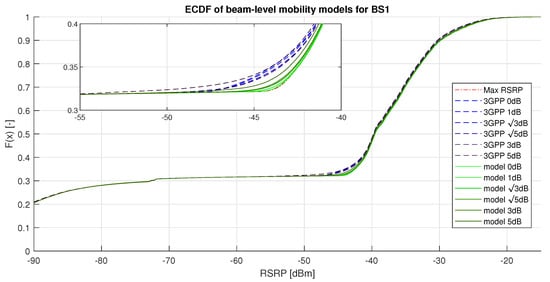 The beam-level mobility model was evaluated on the independent testing dataset for data of BS1. The RSRP measurement data were introduced to varying levels of uncertainty, and the results of the evaluation are shown in Figure 7 and in Table 4. Additional model reflecting the maximum achievable RSRP called “Max RSRP” was included in the analysis. Figure 7 displays the ECDF of the serving RSRP for the considered models. There, determines the probability of the serving RSRP being lower than x [dBm] (the value on the x-axis). The figure shows that the upper half of the distributions are almost identical for all models. This is caused by the fact that there is often only a single strong beam available, and all models were able to choose the serving beam successfully. The lower part of the figure is also similar for all models, as after losing line of sight (LOS), no strong beams become available, and non-line of sight (NLOS) measurements are significantly weaker. The detail in the figure shows the difference between the proposed model’s decision-making and the 3GPP one. There, the figure shows that the proposed solution has approximately higher chance of achieving 44 dB or better signal strength than the 3GPP solution.