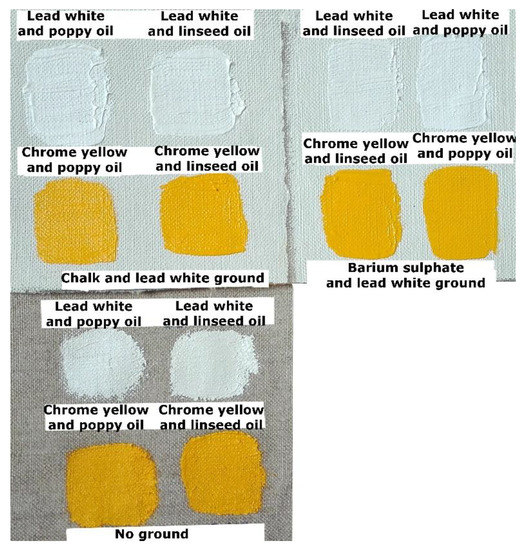 Once the canvas was prepared, two dry pigments were individually hand-ground with linseed oil or poppy oil to make four types of paint that were applied onto both grounds and the bare canvas. The pigments selected were lead white and chrome yellow, a traditional white pigment and a modern yellow pigment, respectively, often present in the Impressionist palette and bound in poppy oil due to their light shade [16]. The aim was to explore the potential of the non-invasive approach used in this study to differentiate the two drying oils despite the use of different pigments and different grounds.