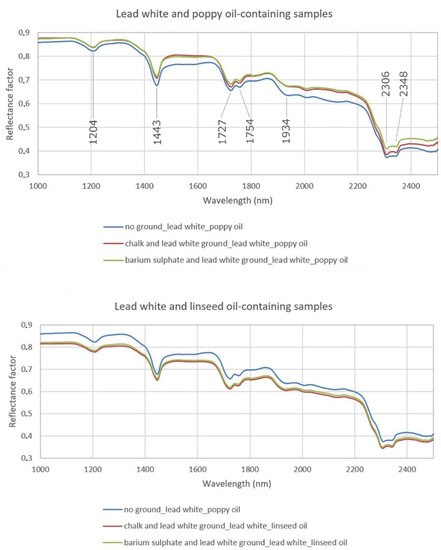 The results obtained in this study provided data that can be used to differentiate and map linseed and poppy oil used in experimental samples of oil paints. Further research will be required to explore the way the spectral range 1724–1754 nm contributes to the differentiation of these two types of drying oils, which could include, for example, examining the ratio between the bands or comparing the area under the curve of these bands.