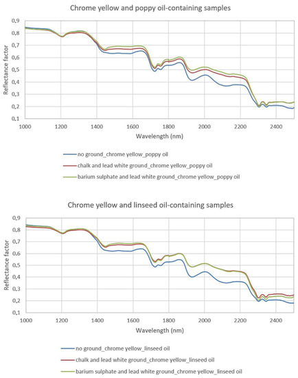 This paper is part of an ongoing study of Impressionist painting techniques. Analyses of the binding media used by Impressionist artists based on gas-chromatography show the use of both linseed and poppy oil, and either walnut oil or mixtures of linseed and poppy oil [16,17,18,19]. This paper presents the results from the examination of a set of experimental samples using fibre optic reflectance spectroscopy (FORS) and diffuse reflectance imaging spectroscopy in the short-wave infrared (SWIR) range, processed using methods of statistical analysis for the discrimination and mapping of poppy and linseed oil. The aim was to evaluate the efficacy of this non-invasive approach to the study of simplified paint samples preliminary to the application of the method for characterisation of these two drying oils in painted art.