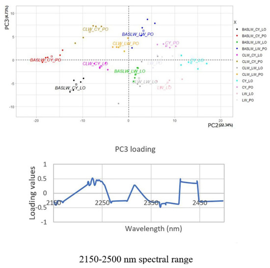 PCA allowed differentiation between the samples containing the two different drying oils in almost all cases. Overall, the data showed that the greatest contributions to the PCs that discriminated between the two drying oils were due to the spectral regions around 1724, 1738, and 1754 nm (see Table 2 and also Table S1 in the Supplementary Materials). The signals around 1724 and 1754 nm always had opposite values (+/−) compared to the signal at around 1738 nm, indicating that the first two were directly correlated. Examination of the reflectance spectra of the samples and of their first derivatives showed that the signals at 1724 nm and at 1754 nm appeared as peaks in the reflectance spectra and as zero crossing points in their first derivative. The signal at 1738 nm was a minimum in the reflectance spectrum and a zero-crossing point in the first derivative. When the smaller range of 2150–2500 nm was considered, it was still possible to discriminate between the samples containing the two different oils. As illustrated below, the spectral variations in this range are likely due to contributions from the antisymmetric/symmetric stretching and bending of the methylenic CH2 groups. However, discrimination in the range of 2150–2500 nm was less distinctive, suggesting that this spectral range is less discriminating than the range around 1700 nm. This is due to the influence of spectral features from both the pigments and other materials used to prepare the samples. Examples are the carbonate anion combination band of hydrocerussite in the 2300 nm region present in the spectra collected from the lead white-containing samples, which alter the doublet near 2306 and 2348 nm related to the antisymmetric/symmetric stretching and bending of the methylenic CH2 groups in the drying oils, and the absorption band at about 2100 nm due to the combination of OH and CH stretching vibrations characteristic of cellulose in the canvas, which is present in the spectra collected from the paint samples where chrome yellow paint was applied onto the unprimed canvas, while it is not visible in those spectra collected from paint samples where lead white is present in the ground and in the paint layers [23].