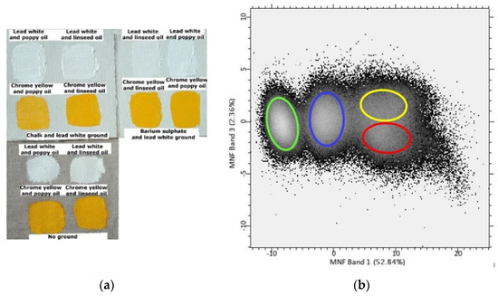 The following are available online at https://www.mdpi.com/1424-8220/20/24/7125/s1, Figure S1: Score plots and related loading plots of PCA applied to the first derivative of the FORS spectra acquired from the experimental samples in the range 1650–2500 nm. Figure S2: Score plots and related loading plots of PCA applied to the first derivative of the FORS spectra acquired from the experimental samples in the range 1650–1850 nm. Figure S3: Score plots and related loading plots of PCA applied to the first derivative of the FORS spectra acquired from the experimental samples in the range 2150–2500 nm. Figure S4: Top left: visible light image of the samples. Top right: scatter plot of MNF band 1–MNF band 2 of chrome yellow paints applied on both ground layers. Range 1653–1848 nm. Bottom left: classified image based on the classes identified in the scatter plot. Bottom right: loading plot of MNF band 2. Figure S5: Top left: visible light image of the samples. Top right: scatter plot of MNF band 1–MNF band 2 of lead white paints applied on both ground layers. Range 1653–1848 nm. Bottom left: classified image based on the classes identified in the scatter plot. Bottom right: loading plot of MNF band 2. Figure S6: Top left: visible light image of the samples. Top right: scatter plot of MNF band 1–MNF band 3 of lead white and chrome yellow paints applied on both ground layers. Range 1653–1848 nm. Bottom left: classified image based on the classes identified in the scatter plot. Bottom right: loading plot of MNF band 3. Figure S7: Top left: visible light image of the samples. Top right: scatter plot of MNF band 1–MNF band 2 of lead white and chrome yellow paints applied on the bare canvas. Range 1653–1848 nm. Range 1653–1848 nm. Bottom left: classified image based on the classes identified in the scatter plot. Bottom right: loading plot of MNF band 2. Table S1: Bands that have more impact on the principal components illustrated in Figures S1 to S3, organised by decreasing loading value. Table S2: Bands that have more impact on the MNF bands illustrated in Figures S4 to S7, organised by decreasing loading value.