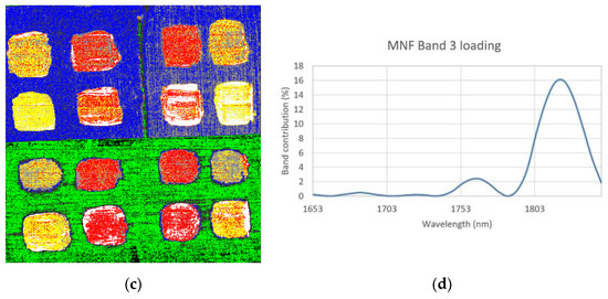 (a) Visible light image of the samples; (b) scatter plot of minimum noise fraction transform (MNF) band 1–band 3. Range 1653–1848 nm. The different classes identified in the scatter plot have been highlighted by hand using different colours and their distribution in the samples is visualized in the classified image; (c) classified image based on the classes identified in the scatter plot; (d) loading plot of MNF band 3.