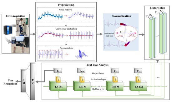 The ECG, a representative bio-signal inside the body, is unique to each individual, owing to the electrophysiological factors of the heart, as well as its location, size, and physical condition. However, because it is an electrical signal, it is affected by behavioral features and varies according to the measurement environment []. Particularly, post- and pre-exercise ECGs do not coincide, because of the temporary tachycardia, which can degrade the user recognition performance. Although studies on normalization have been conducted to match post- and pre-exercise ECGs, they experience problems such as distortions of the P wave, QRS complexes, and T wave, which are morphological features as well as unique biometric information.