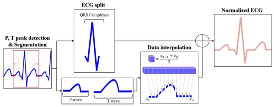A normalization method that excludes the ECG cycles that do not match the enrolled ideal ECG, through cross-correlation analysis is proposed in []. A normalization method for resampling the data of each section of the P wave, QRS complexes, and T wave of one ECG cycle is proposed in []. A correction process using the valley of the P wave and peak of the R wave, a process of normalizing the data of each section of the P wave, QRS complexes, and T wave of the ECG signal, and a normalizing method with one cycle that is passed by similarity with the enrollment data in each section are proposed in []. Normalization through segmentation by setting one ECG cycle is conducted in []. Normalization that segments the P and T sections, based on the R wave is conducted in []. Normalization is performed with 360 data samples based on the R wave, in []. The ECG normalization method in the normal state considers only noise removal and morphological features. It does not consider normalization for tachycardia ECG that may generally occur in the post-exercise state.