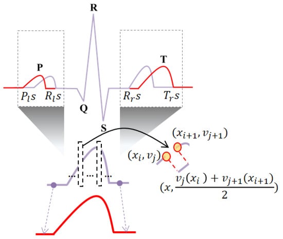 The linear data interpolation of the P and T waves is performed using interpolation count, position, and amplitude calculations, as shown in Figure 6. The interpolation count is calculated as the difference between the normalized data of the P and T waves and actual data using (1).
