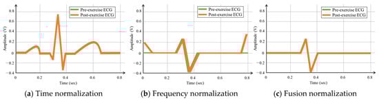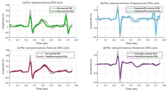 ECG signal cycle in pre and post-exercise cases as time, frequency, and fusion normalization.