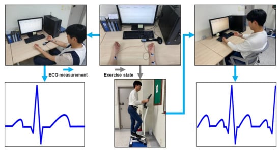 The ECG measurement was performed three times for each subject at 2–3 day intervals. It was measured for 60 s before exercise and 180 s after exercise in a comfortable sitting posture as shown in Figure 8. To measure the post-exercise ECG, the subject exercised with a stepper for 180 s with attached electrodes. The post-exercise ECG was measured immediately after the exercise, in a sitting posture. The ECG obtained from the measuring instrument MP160 was lead-I ECG, which could be acquired from both wrists using wet electrodes at a sampling rate of 2000 Hz based on the international standard 12-lead electrocardiography. An experiment for evaluating the normalization method using the measured ECG data was conducted to analyze the average similarity from the ECG