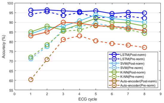 The classification performance of the auto-encoder reached its maximum (90%) when the ECG cycle number was three and decreased afterward. The performances of K-NN and SVM were similar, and their maximum values were 92% and 93.8%, respectively, when the ECG cycle number was five. The classification performances of K-NN and SVM were generally higher than that of the auto-encoder; however, they slowly decreased in the same manner when the ECG cycle number exceeded five. Unlike the classification performance of the other classifiers, that of LSTM reached its maximum (98.7%) when the ECG cycle number was as low as two. The recognition performance of LSTM remained similar or decreased slightly as the ECG cycle number increased. After normalization, LSTM exhibited the highest classification performance compared to all the classifiers.