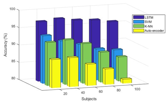 The recognition performance according to the number of subjects and classifier at ECG cycle number four, which was excellent, is shown in Figure 11. Overall, the recognition performance of the auto-encoder is the poorest and decreases slightly as the number of subjects increases; the maximum recognition performance is 88.4% when the number of subjects is 40. The recognition performances of the K-NN and SVM classifiers are similar to the number of subjects increase and are generally higher than that of the auto-encoder but lower than that of the LSTM. The recognition performance of K-NN and SVM decreased with the increase in the number of subjects as was the case in the auto-encoder. The maximum recognition performance of K-NN was 92.9% when the number of subjects was 40, whereas that of SVM was 93.8% when the number of subjects was 20. LSTM exhibited a better overall recognition performance compared to other classifiers when the number of subjects increased. It was least affected by the number of subjects and maintained the recognition performance. The maximum recognition performance of LSTM was 97.7% when the number of subjects was 60. The analysis results showed that LSTM exhibited the most outstanding recognition performance after normalization with respect to the ECG cycles before and after exercise, and with respect to the increasing number of subjects, compared to other classifiers. The recognition performance using LSTM was least affected by the cycle and number of subjects and was maintained stably.