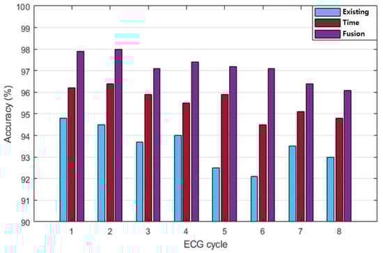 In this study, the recognition performances of existing, time, and fusion normalization methods were compared and analyzed using LSTM, which exhibited the highest recognition performance. The recognition performances were analyzed in terms of the number of ECG cycles when the number of subjects was 100. Figure 12 compares the post-exercise ECG recognition performances of each normalization method, according to the number of ECG cycles. Each normalization method exhibited the highest recognition performance when the ECG cycle number was as low as one or two. The existing method generally exhibited lower recognition performance than the time and fusion methods. The maximum recognition performance of the existing method was 94.8% when the ECG cycle number was one. Overall, the recognition performance of the time normalization method was higher than that of the existing method and lower than that of the fusion method. The maximum recognition performance of the time normalization method was 96.4% when the ECG cycle number was two.