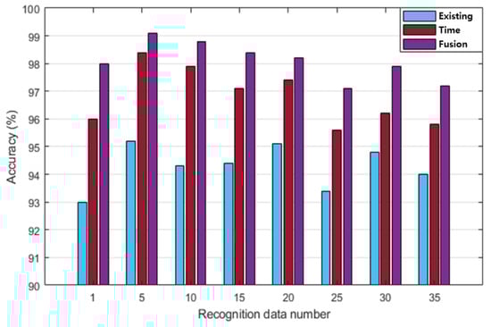 Comparative analysis of post-exercise ECG normalization recognition performance with increasing recognition data (existing, time, and fusion normalization method).