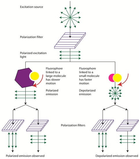Therefore, under fixed viscosity and temperature, the FP is directly proportional to the molecular volume. The change in this volume may occur through the binding or dissociation of molecular complexes, through decomposition, or through conformational changes in the molecule. Small molecules in an aqueous medium rotate very quickly and, between absorption and emission, are equally likely to assume any orientation, which leads to a complete depolarization of emission. Large molecules and intermolecular complexes partially retain the same orientation that they had upon absorption of light even during emission [9]. Therefore, their fluorescence is largely polarized. The FP is characterized by the value of P:
