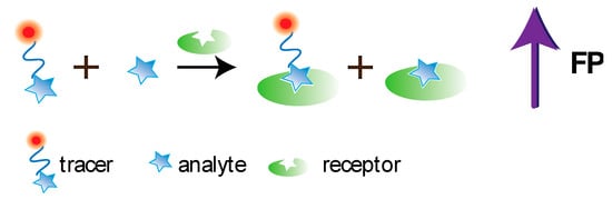 Several works are devoted to the development of non-competitive FPIA. Note that non-competitive format for detecting low molecular weight compounds is a great challenge because small molecules cannot significantly increase the volume and the rotation rate of a fluorophore-labelled receptor (Figure 5).