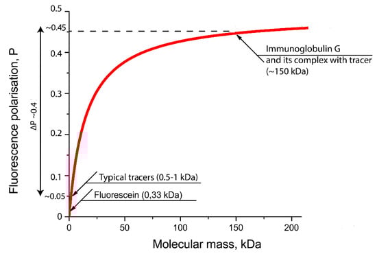 The degree of FP change depends on the label, the average lifetime of the molecule in an excited state, the molecular weight of the analyte and the nature of the complex. Therefore, the choice of a fluorescent label is of key importance. It must have a high fluorescence intensity (i.e., high quantum yield and large extinction coefficient), be chemically and photostable under analytical conditions and easily conjugated to the analyte, and not interfere with the ligand–receptor interaction. For the endogenous fluorescent quenchers present in the sample not to interfere with the determination, their excitation and emission wavelengths must differ from the wavelengths of the fluorescent label. In addition, to reduce the effect of light scattering, the label must have a large Stokes shift [5]. When the temperature and viscosity of the solution are constant, the FP will depend only on the size of the fluorescent molecule. In the case of a competitive assay, the higher the receptor concentration, the higher the ligand concentration required to prevent the formation of the labeled ligand–receptor complex, which leads to a deterioration in the assay sensitivity [5]. Accordingly, to achieve maximum sensitivity, it is necessary to use the minimum amount of the receptor, which ensures reliable registration of the FP change during the transition of the labeled ligand into the complex with the receptor. The most commonly used fluorophore is fluorescein isothiocyanate (FITC). The inclusion of FITC-containing derivative of antigen into immune complexes leads to significant changes of FP as can be seen from Figure 3.