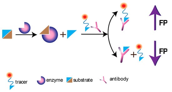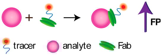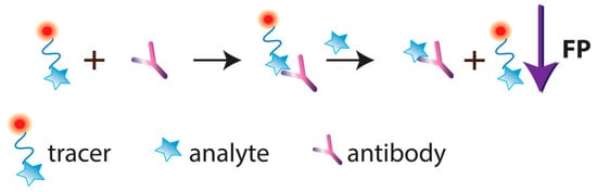 A specific mode of FPIA is so-called single-reagent FPIA, which uses a tracer–antibody complex. After adding such a reagent to the tested sample, the analyte displaces the tracer from the complex, which is detected as a FP decrease (Figure 4).
