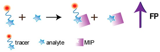 Few MIP-based FPAs can be found in the literature. It may be explained by the difference between the structure of the fluorescently labeled analyte and that of the template molecule can be an obstacle to assay implementation. Studies on FPA using MIP technology included the development of 2,4-D and (S)-propranolol assays [50,51]. The IC50 value for 2,4-D was 10 mM. The FPA of propranolol allowed for the stereospecific determination of (S)-propranolol because the MIPs used were obtained for this stereoisomer. Ton et al. [52] developed FPA based on water-compatible MIP nanoparticles for the detection of enrofloxacin (ENR) and structurally similar antibiotics from a fluoroquinolone group. Because ENR is a UV-excited fluorescent compound, its direct quantitative detection could be performed without separation of free antibiotic from the MIP-bound one. This rapid and robust FPA was applied for detecting ENR in milk and tap water without a preconcentration step. The LoD for ENR was 0.1 nM. Murase et al. [53] synthesized core-shell MIP nanoparticles for FP-based determining cortisol. A competitive FPA was carried out using free and dansyl-labeled cortisol. The achieved LoD was 80 nM. Xiao et al. [54] developed a MIP-based FPA for micromolar determination of diclofenac in water based on a cyclodextrin polymer having an inherent affinity for the target analyte. The detected pharmaceutical displaced a fluorescein sodium salt as a dye adsorbed in the cyclodextrin-based polymer, resulting in the growth of the FP of the released dye. The test system allowed for the detection of diclofenac in wastewater with a LoD of 1 M.