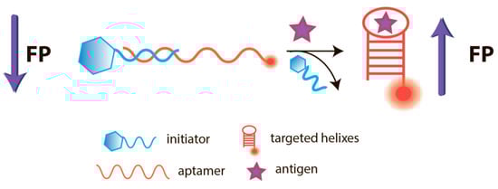 As an alternative to catalytic cleavage, other approaches have been proposed for increasing the receptor mass. Samokhvalov et al. [11] developed a sensitive FP analysis of OTA where an aptamer as the receptor was included in complexes with protein modules to enhance its size. Fluorophore-labelled and free OTA competitively interacted with aptamer-based receptors. The binding of labelled OTA with aptamer–anchors complexes led to the increase of a FP in comparison with that resulting from binding with a free aptamer. Accordingly, a 40-fold gain in the assay sensitivity was achieved. The OTA LoD in red wine was 1.1 µg/kg (2.8 nM). Cui et al. [42] proposed a direct FPA of adenosine and cocaine using a fluorescently labeled chimeric aptamer consisting of cocaine/adenosine and thrombin recognition sites. Chimeric aptamers were designed in such a way that upon adenosine or cocaine binding, a thrombin-recognition site was released. This led to the binding of the aptamer to thrombin (MW = 40 kDa), which was accompanied by a significant change in the FP of the label. Huang et al. proposed a scheme for adenosine detection using a fluorescein-labeled chimeric aptamer [49]. Conformational changes of the labeled chimeric aptamer in the presence of adenosine underlie the principle of the assay. Accordingly, it could specifically hybridize with the complementary sequence immobilized on silica nanoparticles, thereby causing a significant change in the FP of the label.